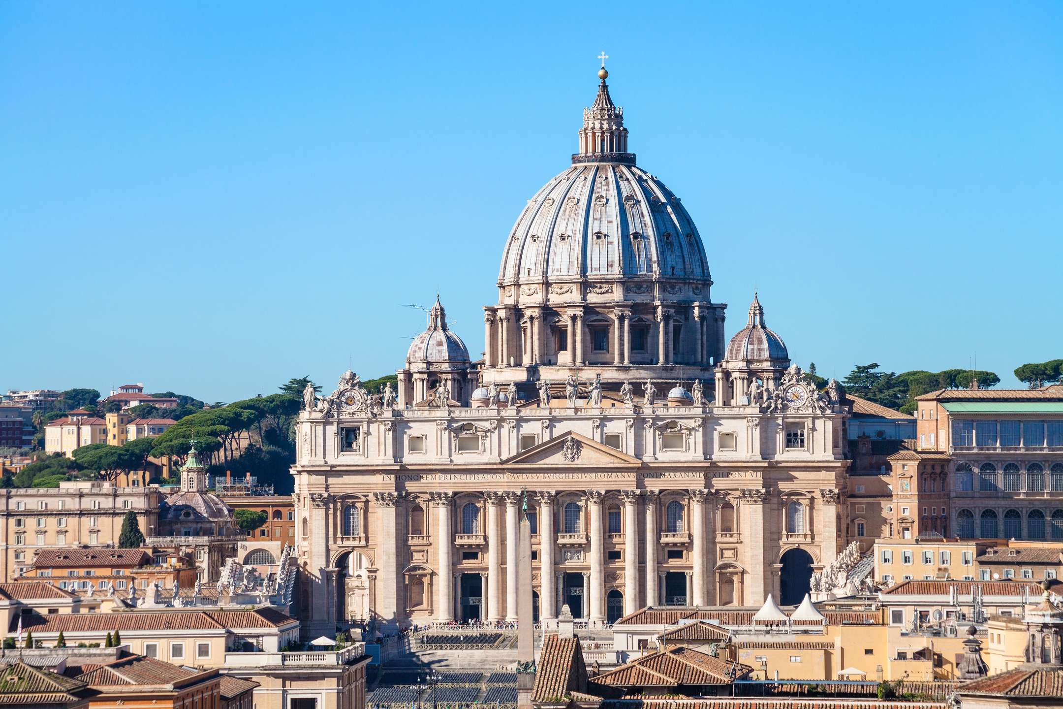 Located at the very tip of the elliptical St. Peter's Square, which itself is bordered by a Doric colonnade, is the iconic basilica of St. Peter. There are thirteen statues of Christ, John the Baptist, and eleven of the Apostles atop the vast order of Corinthian columns that make up the facade created by Carlo Maderno. Two Saints Peter and Paul statues, each standing 18 feet tall, guard the stairs leading up to it. There are four enormous piers and pendentives supporting the dome that Michelangelo's student Giacomo della Porta built.