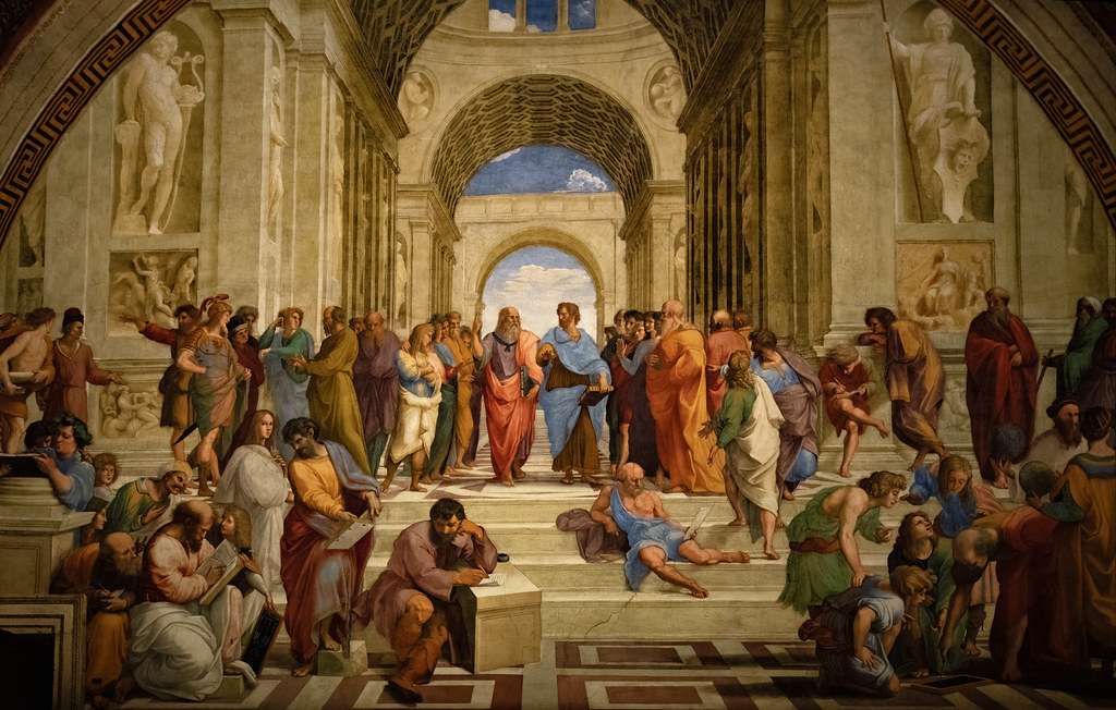 The School of Athens fresco depicts the greatest philosophers and scientists of ancient Greece, including Plato, Aristotle, and Pythagoras, gathered in the courtyard of a classical building. The painting is a tribute to the Renaissance's passion for classical culture and learning.